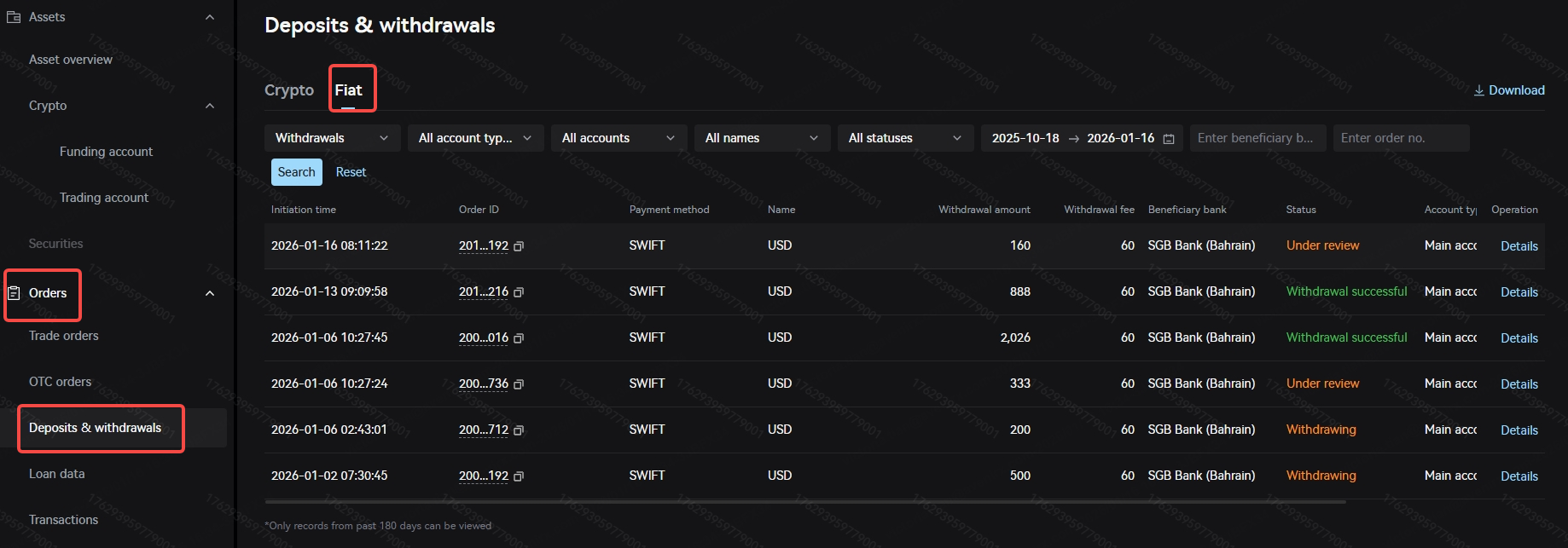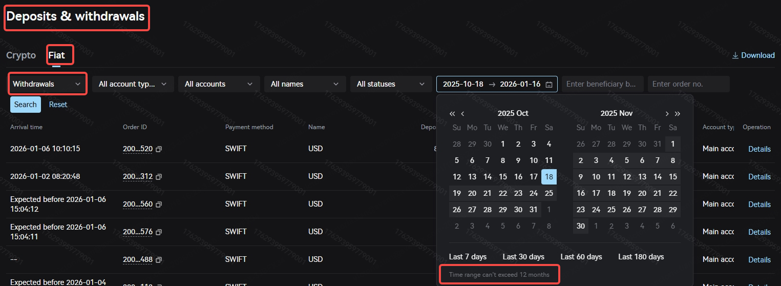 You can view all your fiat deposit and withdrawal orders in the menu "Orders > Deposits & Withdrawals > Fiat", or in the "Asset Overview" or "Funding Account" page on the right side under "Deposits & Withdrawals > Fiat". Currently, the client can retrieve deposit and withdrawal orders within the last 12 months.