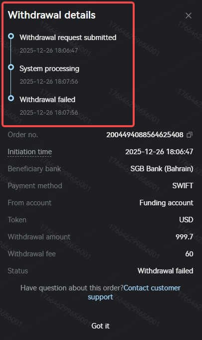 If your withdrawal order is rejected by the platform or bank, its status will show as "Withdrawal Failed." For orders rejected before the bank pays out the funds, the frozen fiat currency amount will be unfrozen, increasing your available balance. You will receive notifications via email, SMS, and message center.