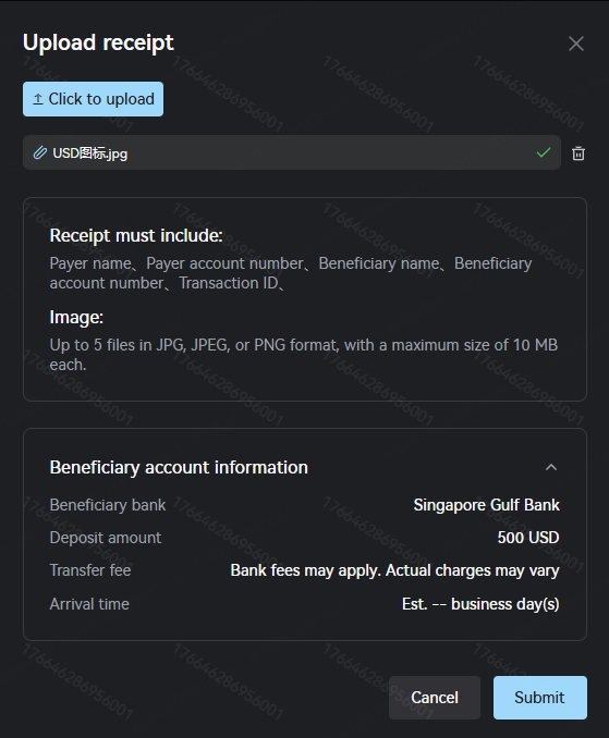 After clicking "Already transferred", a pop-up window will appear. Please upload your online banking or mobile banking's transfer receipt to be evidence of the bank transfer, regardless of the form—payment advice, account statement, screenshot of the remittance page, transaction details enquiry, etc. The transfer receipt must include: Payer's name, Payer's account number, Beneficiary name, Beneficiary account number, and Transaction ID. Uploading the transfer receipt can speed up the process of your fiat deposit.