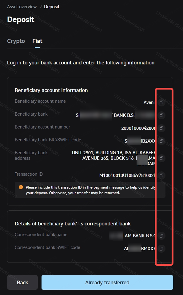 At this point, you need to log in to your online banking or mobile banking to complete the SWIFT remittance. You can click the copy button on the right to fill in all the receiving account information in your online banking or mobile banking remittance page. Before remitting, please check that your payment account is in the same name as the receiving account in section 4/4 of the deposit page, and ensure that your deposit amount is within your daily and monthly deposit limits.