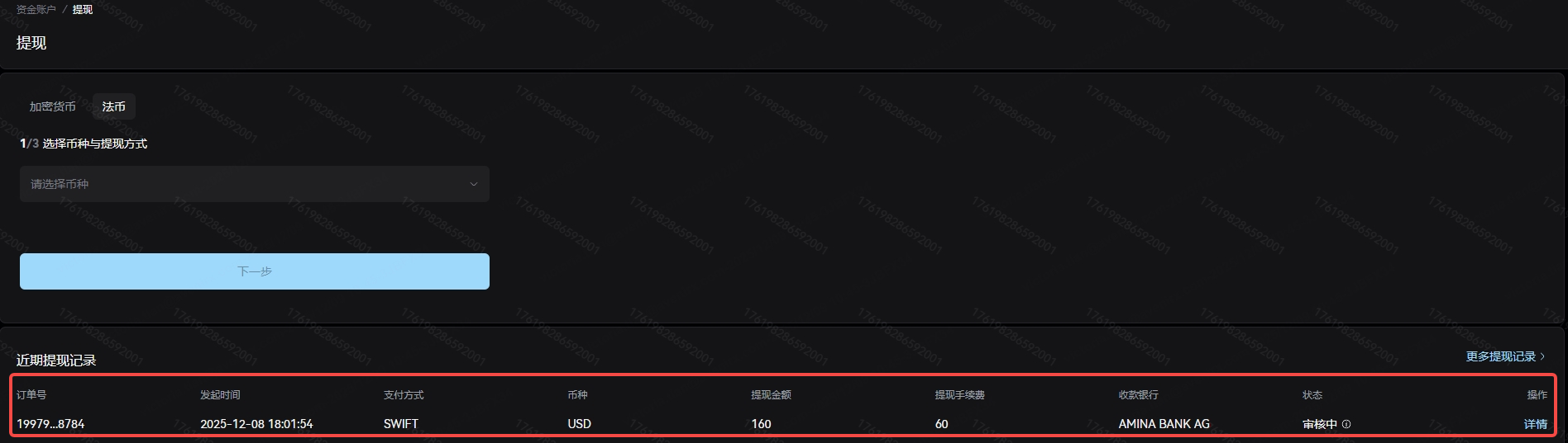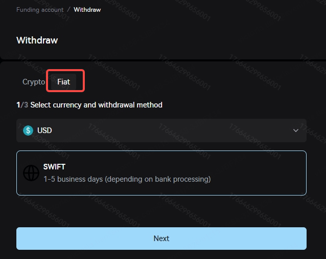 Enter the "Fiat" withdrawal page, and select the currency, withdrawal method, and beneficiary bank account from the drop-down menu. When making your first withdrawal or withdrawing to a beneficiary bank account that you have never used on Xcoin before, you need to click "+Add bank account" to bind the beneficiary bank account information. Please note that your beneficiary bank account must be a bank account that has been used for fiat deposits before! If you have never made a fiat deposit, please first initiate a fiat deposit from your bank account to the Xcoin platform. Only after the deposit is successful can the beneficiary bank account be used for withdrawals.