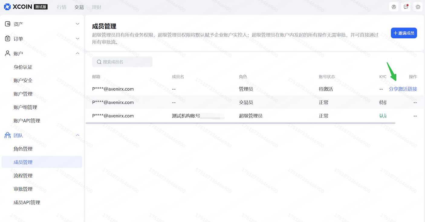 - 成功邀请后,被邀请成员信息会出现在列表中,被邀请成员邮箱会收到含有邀请链接的邮件,可自行点击链接进行激活注册;机构用户也可选择“分享激活链接”,手动分享: