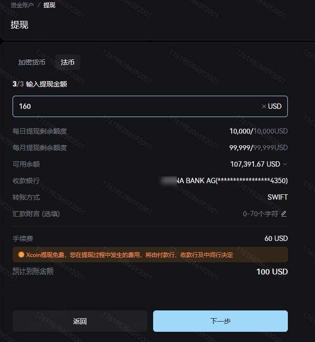 输入提现金额后,页面展示币种、转账方式、收款银行及账号,帮助您检查填写的重要信息无误。请注意:您的提现金额应该≤可用余额,并且在每日、每月提现剩余额度之内。此处的预计到账金额=您输入的提现金额-付款行费用,若汇款途中另外产生中间行、收款行费用,您的实际到账金额将小于预计到账金额。